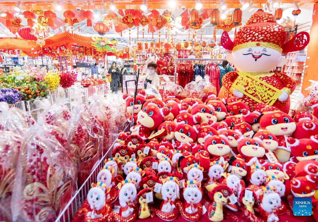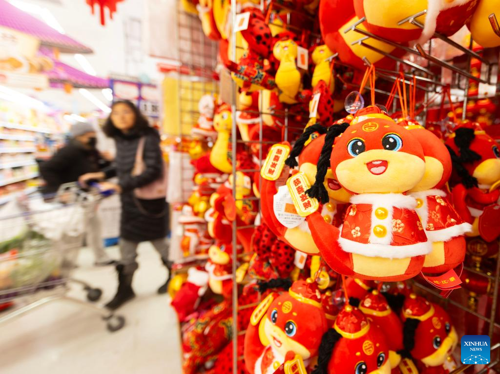 Decorations and ornaments marking the upcoming Chinese Lunar New Year of Snake are seen at a supermarket in Toronto, Canada, Jan. 10, 2025. (Photo by Zou Zheng/Xinhua)