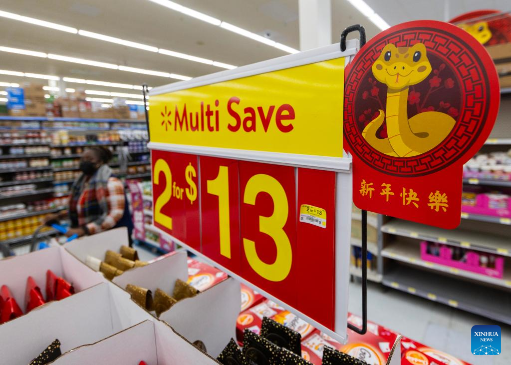 A decoration marking the upcoming Chinese Lunar New Year of Snake is seen at a Walmart store in Toronto, Canada, Jan. 10, 2025. (Photo by Zou Zheng/Xinhua)