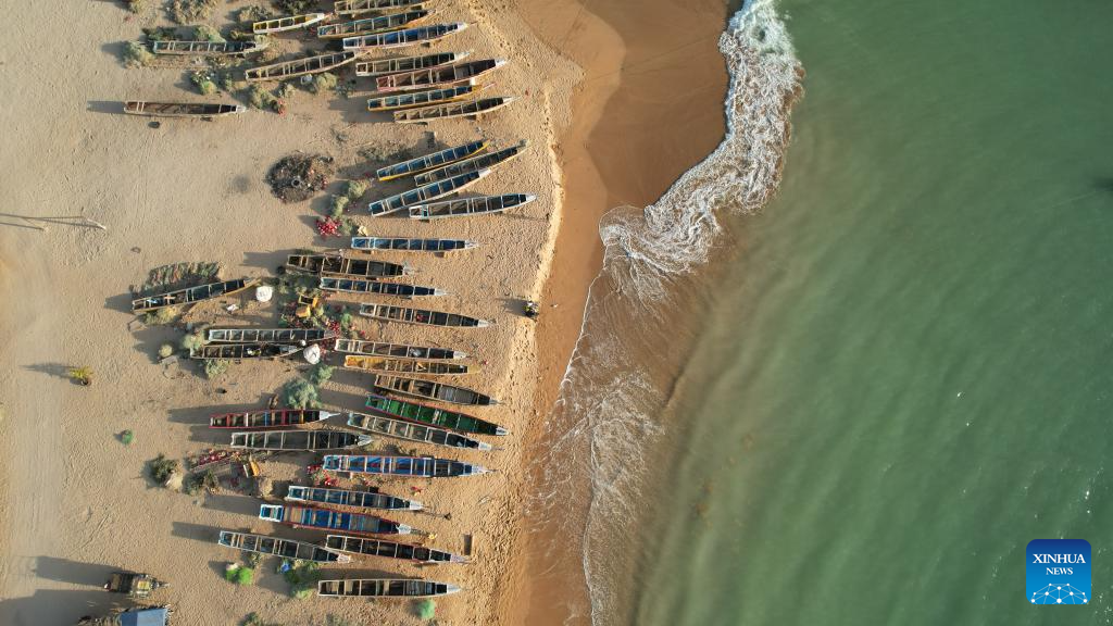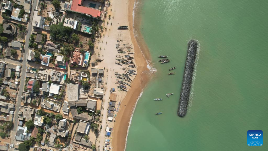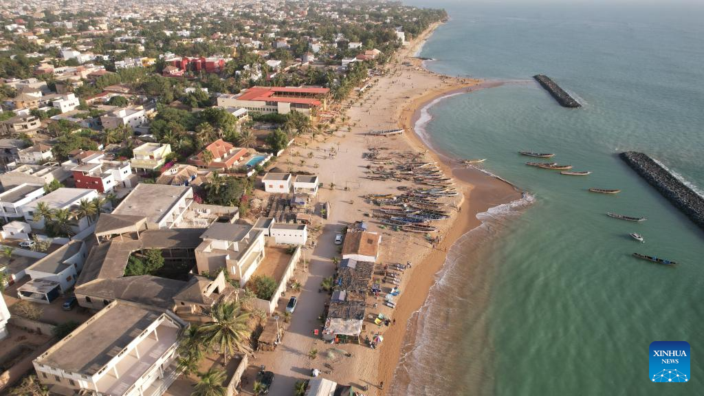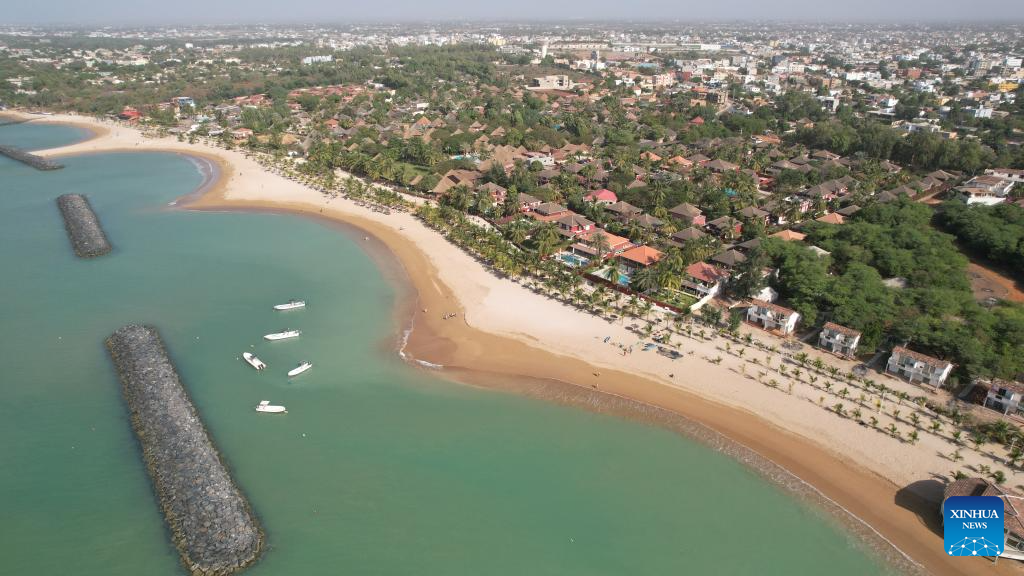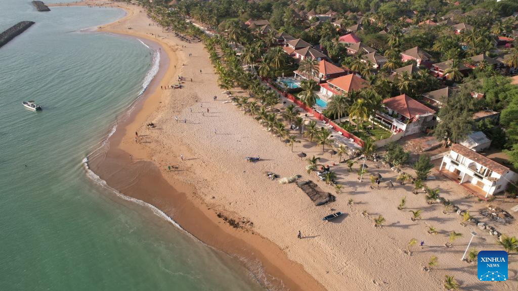 An aerial drone photo taken on Jan. 12, 2025 shows a view of Saly seaside resort area, about 80 kilometers south of Dakar, Senegal. Saly is a popular seaside resort area in Senegal which is known for its golden sandy beaches, warm climate, and a variety of water activities. (Xinhua/Si Yuan)