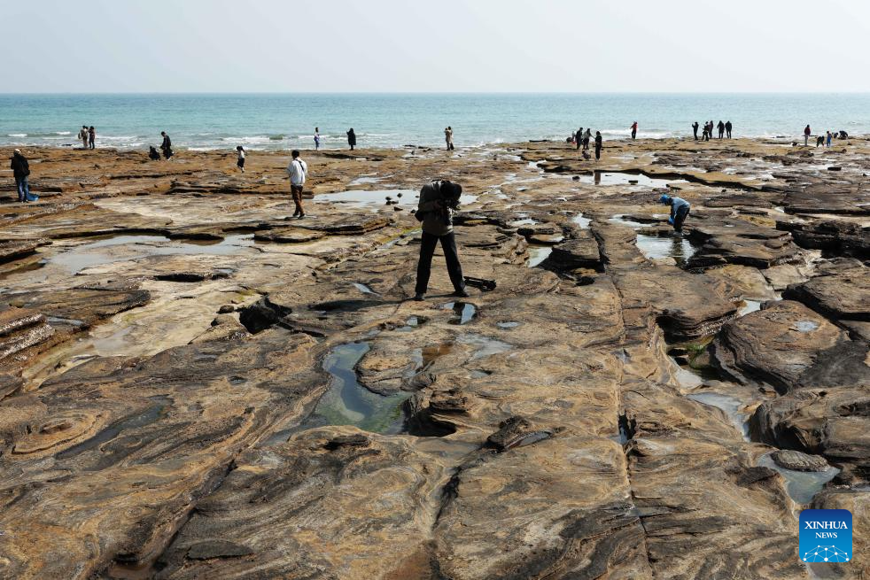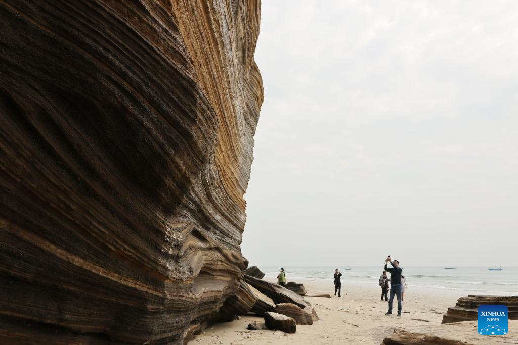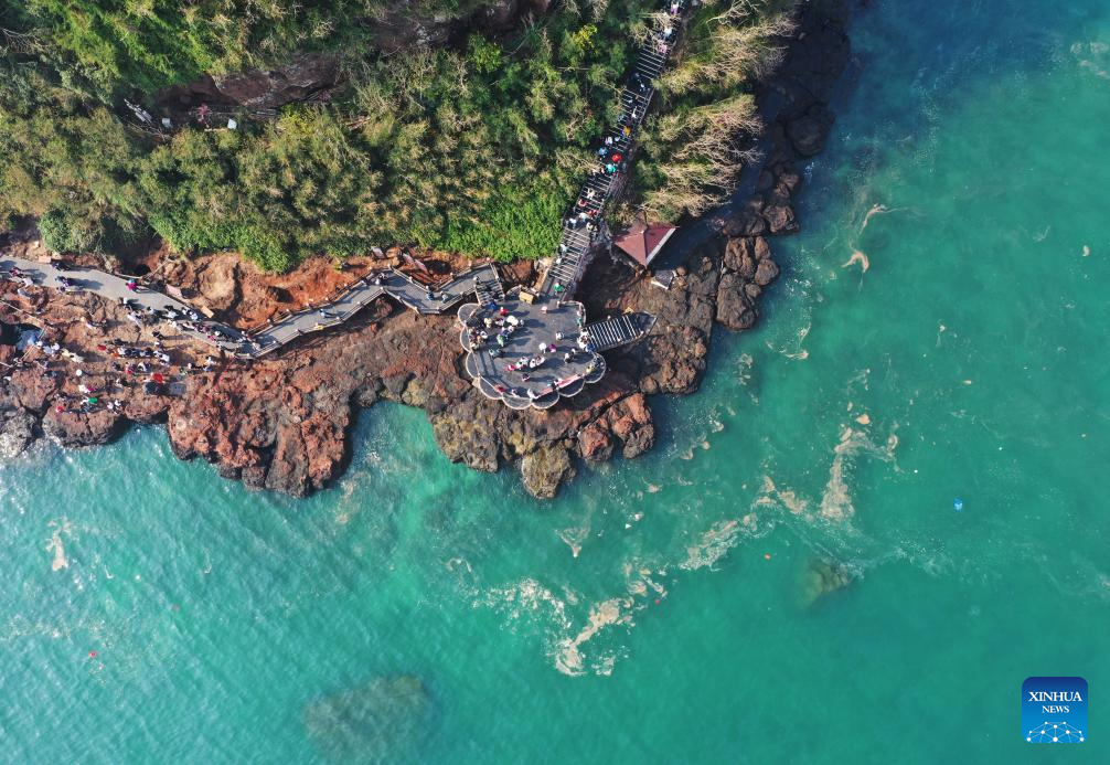 Visitors take photos of rocks at Weizhou Island in south China's Guangxi Zhuang Autonomous Region, Jan. 7, 2025. Weizhou Island, located in the Beibu Gulf, is China's youngest volcanic island. In recent years, the local government has strengthened marine ecological protection and developed infrastructure on the island, making it a popular tourist destination. (Xinhua/Jin Haoyuan)