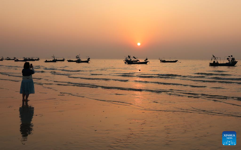 A visitor takes photos of Weizhou Island at sunset in south China's Guangxi Zhuang Autonomous Region, Jan. 5, 2025. Weizhou Island, located in the Beibu Gulf, is China's youngest volcanic island. In recent years, the local government has strengthened marine ecological protection and developed infrastructure on the island, making it a popular tourist destination. (Xinhua/Jin Haoyuan)