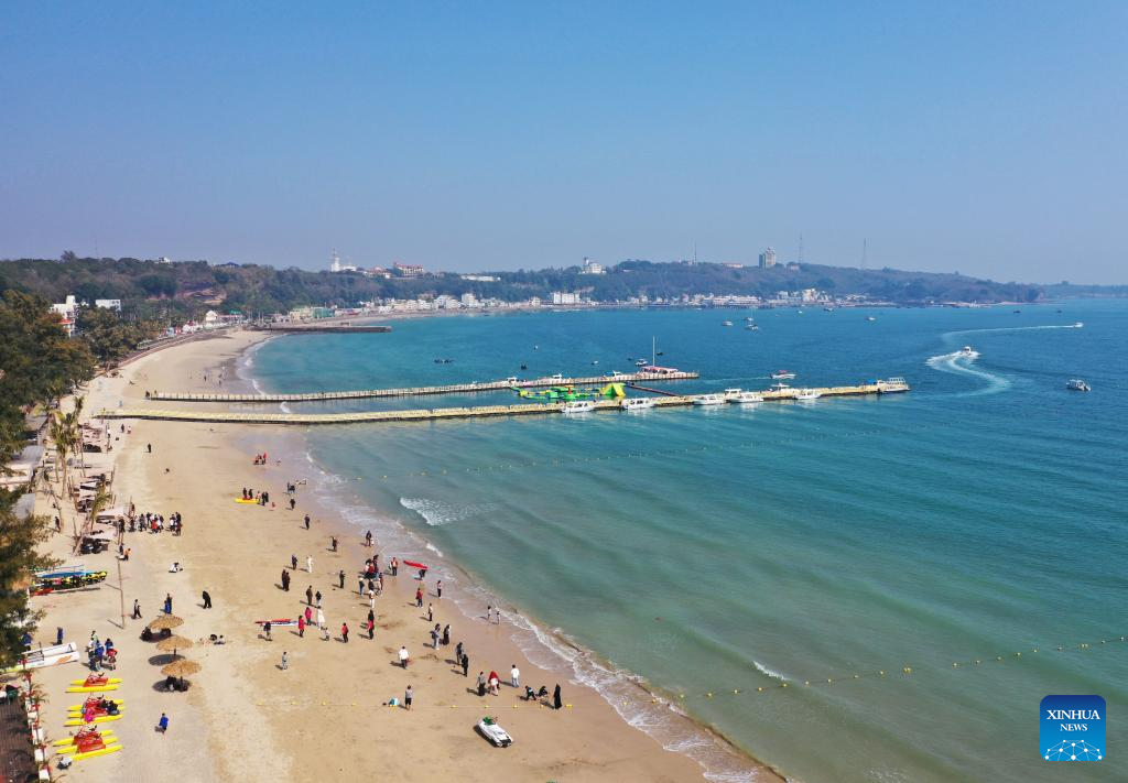An aerial drone photo taken on Jan. 18, 2025 shows people visiting the Weizhou Island in south China's Guangxi Zhuang Autonomous Region. Weizhou Island, located in the Beibu Gulf, is China's youngest volcanic island. In recent years, the local government has strengthened marine ecological protection and developed infrastructure on the island, making it a popular tourist destination. (Xinhua/Jin Haoyuan)