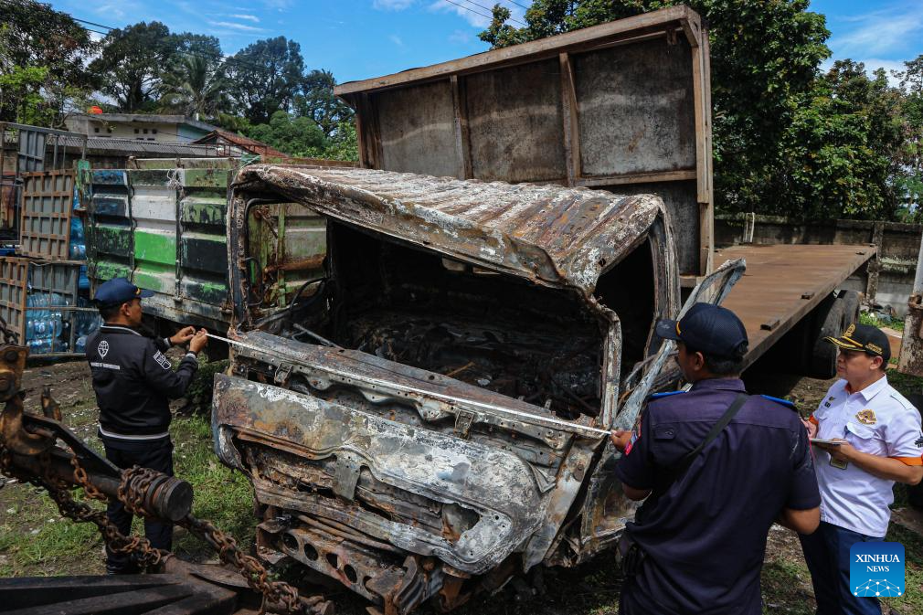 Officers work with a damaged truck after a traffic accident near the Ciawi Toll Gate in Bogor Regency, Indonesia, Feb. 5, 2025. Eight people were killed and 11 others were injured in a traffic accident in Indonesia's West Java province on Tuesday night, a senior official confirmed on Wednesday morning. (Photo by Rangga Firmansyah/Xinhua)