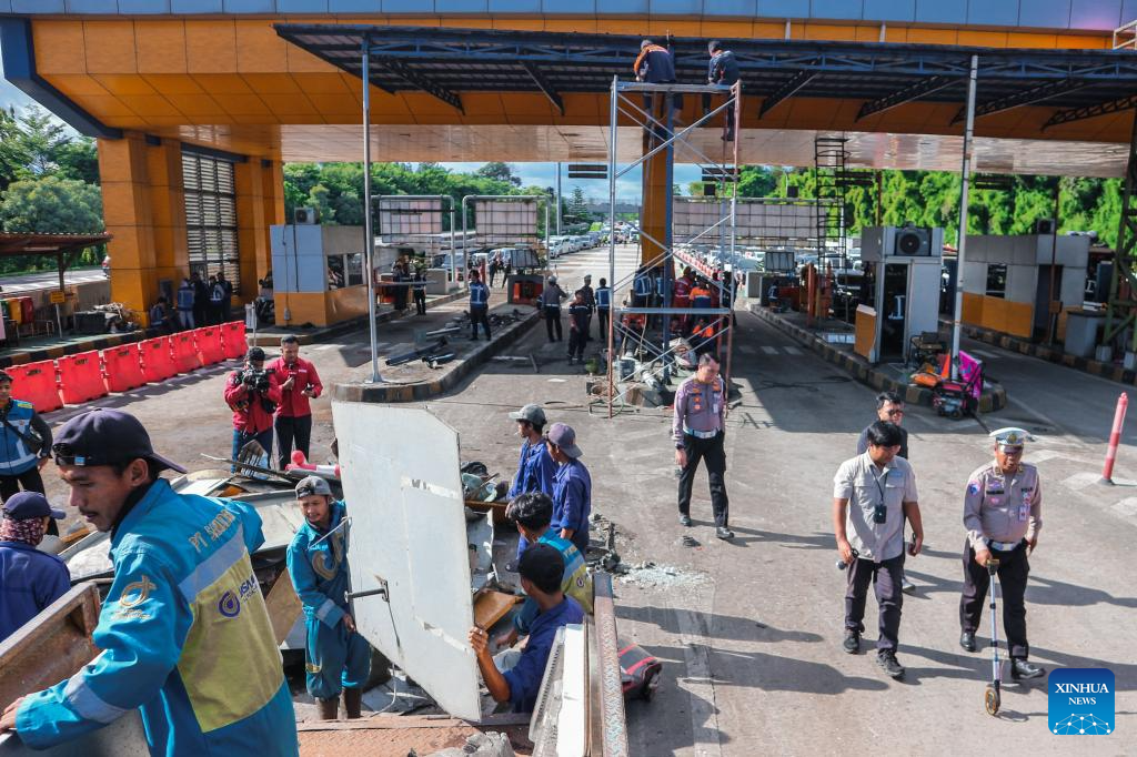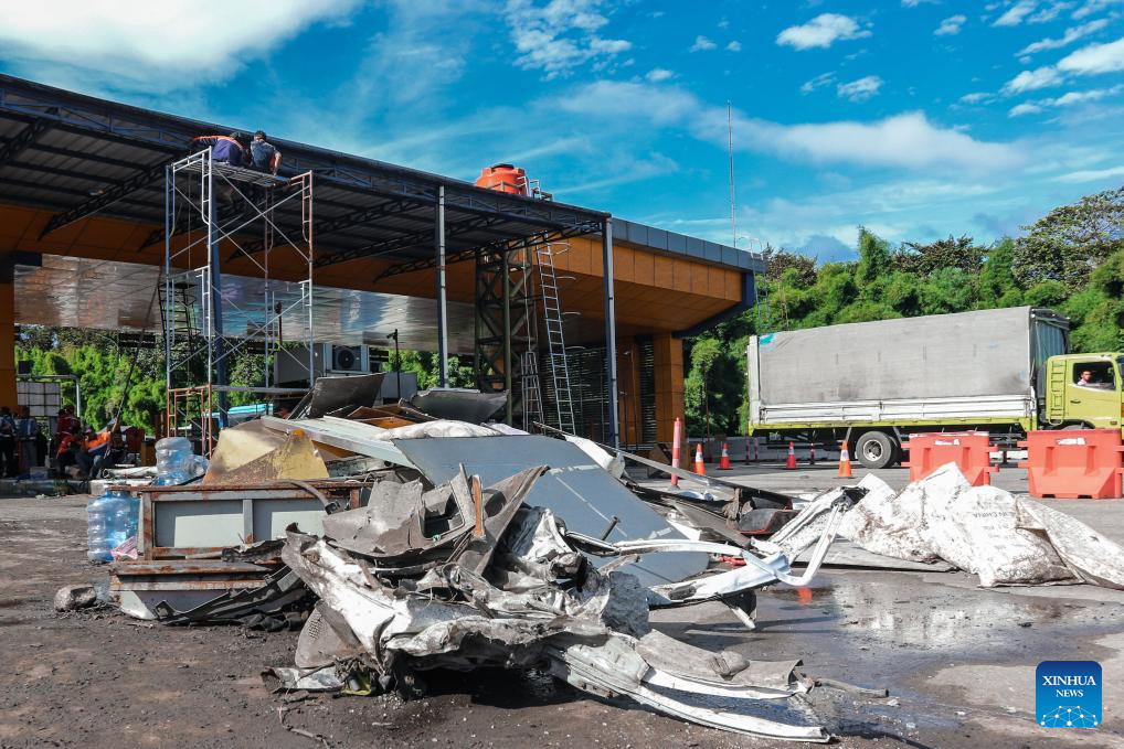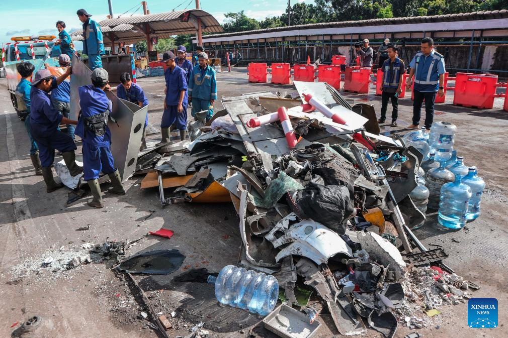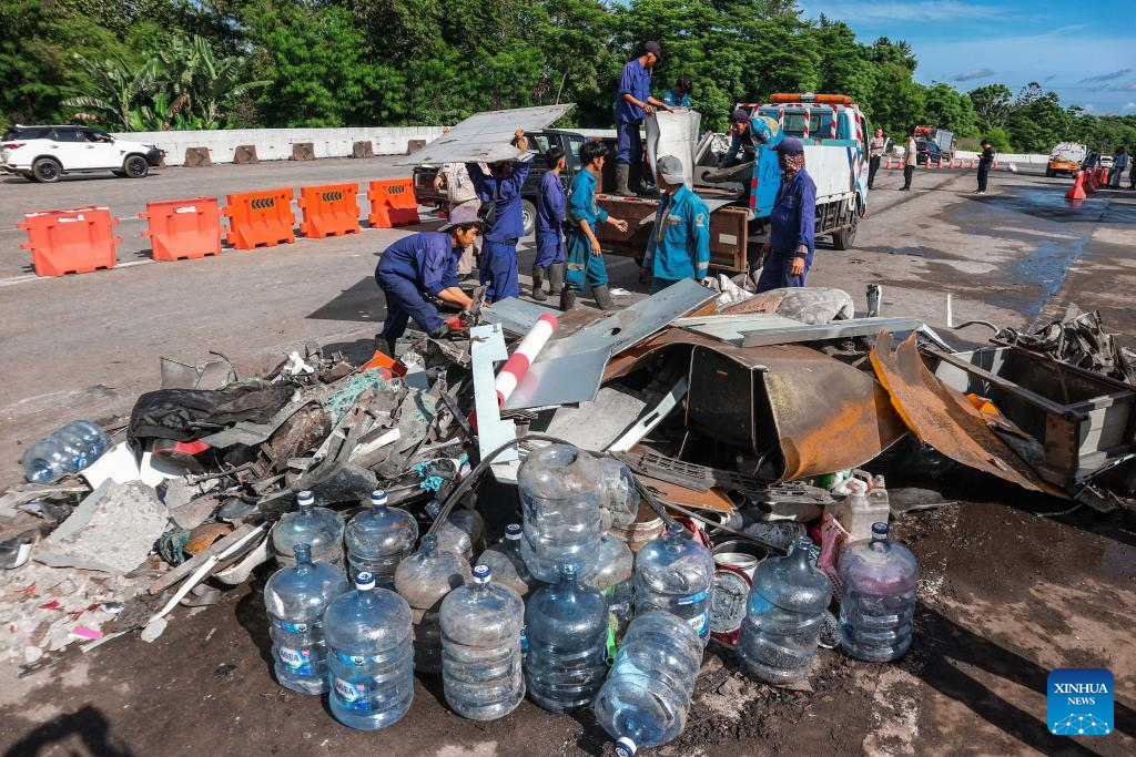 People collect the wreckage at the site of a traffic accident near the Ciawi Toll Gate in Bogor Regency, Indonesia, Feb. 5, 2025. Eight people were killed and 11 others were injured in a traffic accident in Indonesia's West Java province on Tuesday night, a senior official confirmed on Wednesday morning. (Photo by Rangga Firmansyah/Xinhua)