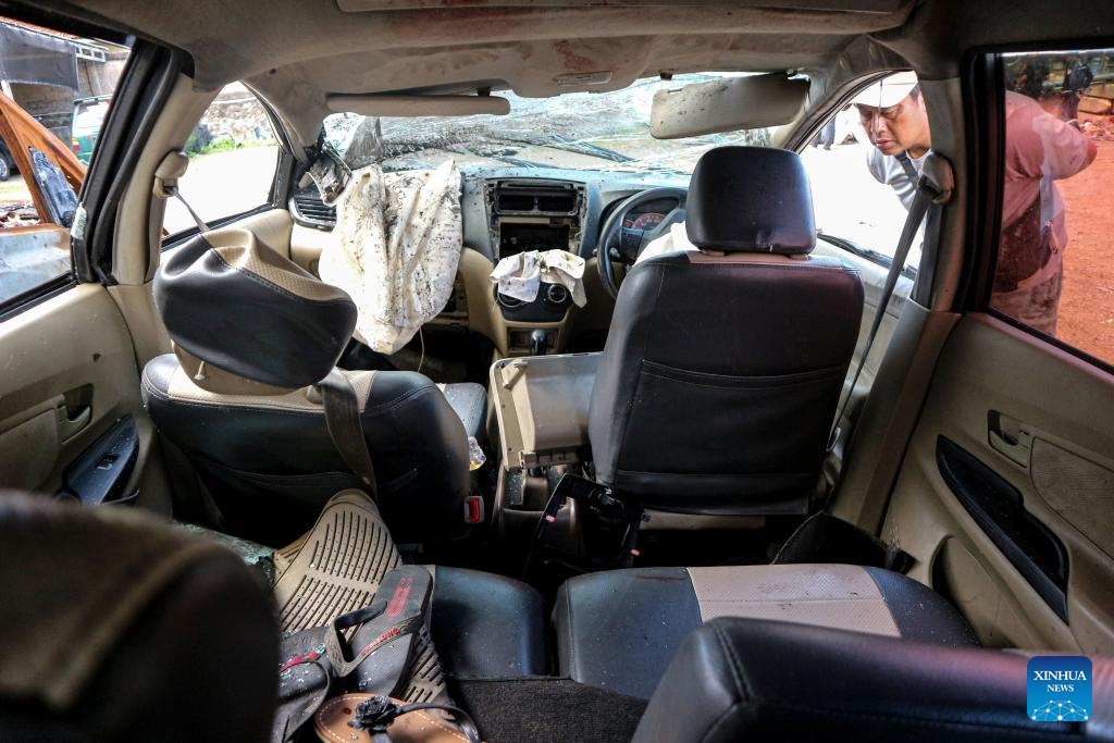 A man looks at the interior of a damaged vehicle after a traffic accident near the Ciawi Toll Gate in Bogor Regency, Indonesia, Feb. 5, 2025. Eight people were killed and 11 others were injured in a traffic accident in Indonesia's West Java province on Tuesday night, a senior official confirmed on Wednesday morning. (Photo by Rangga Firmansyah/Xinhua)