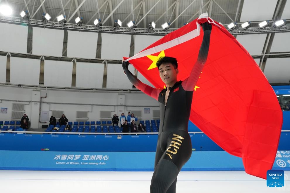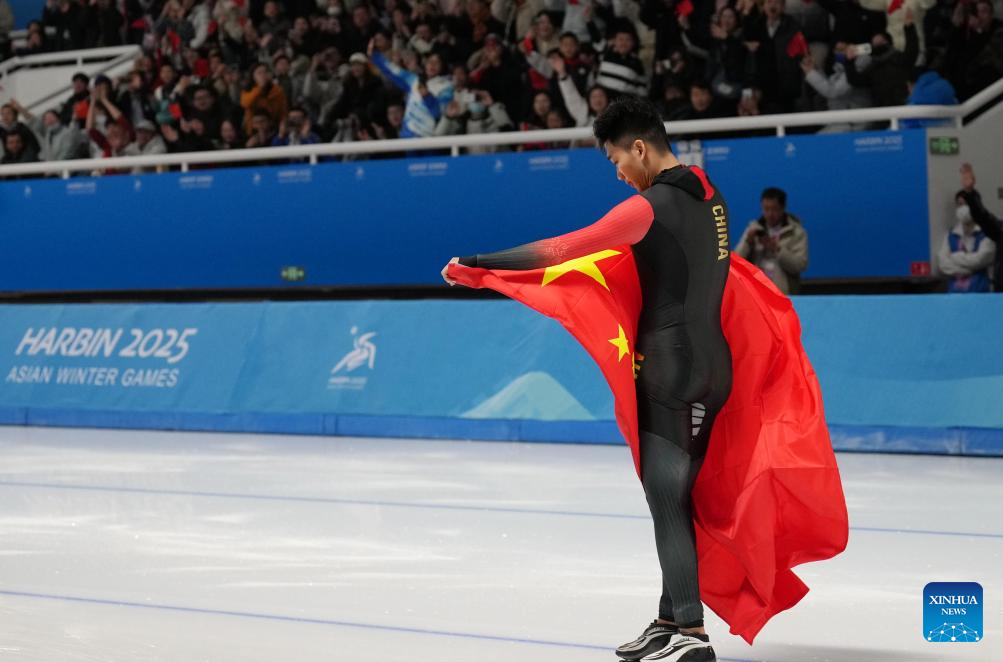 Gao Tingyu of China celebrates after the men's 100m final match of the speed skating event at the 9th Asian Winter Games in Harbin, northeast China's Heilongjiang Province, Feb. 8, 2025. (Xinhua/Wang Kaiyan)