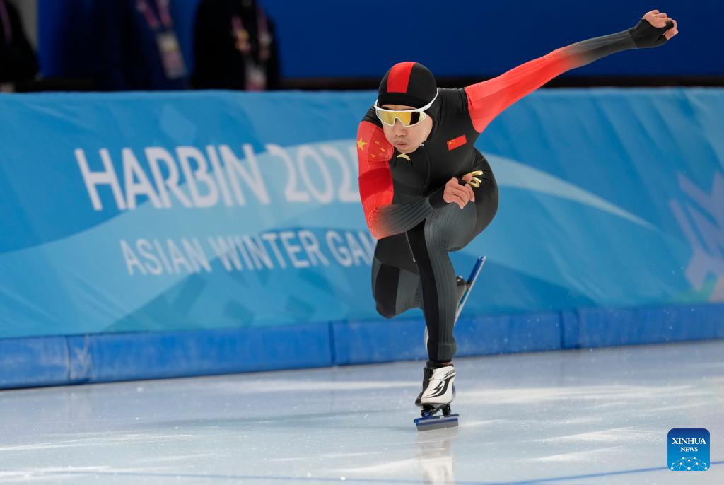 Gao Tingyu of China competes during the men's 100m final match of the speed skating event at the 9th Asian Winter Games in Harbin, northeast China's Heilongjiang Province, Feb. 8, 2025. (Xinhua/Wang Xi)