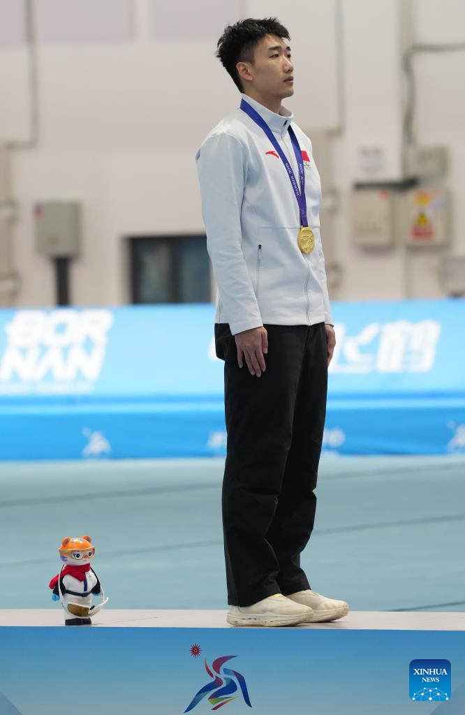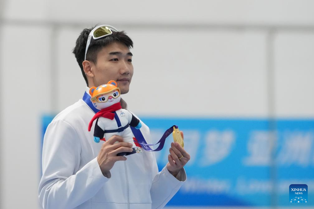 Gold medalist Gao Tingyu of China attends the awarding ceremony the men's 100m final match of the speed skating event at the 9th Asian Winter Games in Harbin, northeast China's Heilongjiang Province, Feb. 8, 2025. (Xinhua/Li Yibo)