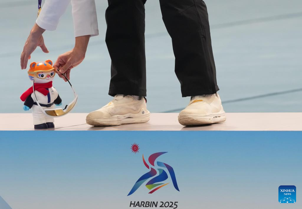 Gold medalist Gao Tingyu of China puts the mascot on the podium during the awarding ceremony after the men's 100m final match of the speed skating event at the 9th Asian Winter Games in Harbin, northeast China's Heilongjiang Province, Feb. 8, 2025. (Xinhua/Li Yibo)
