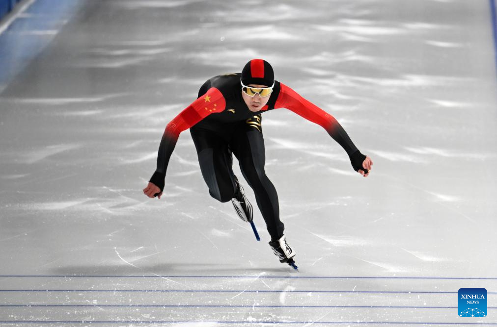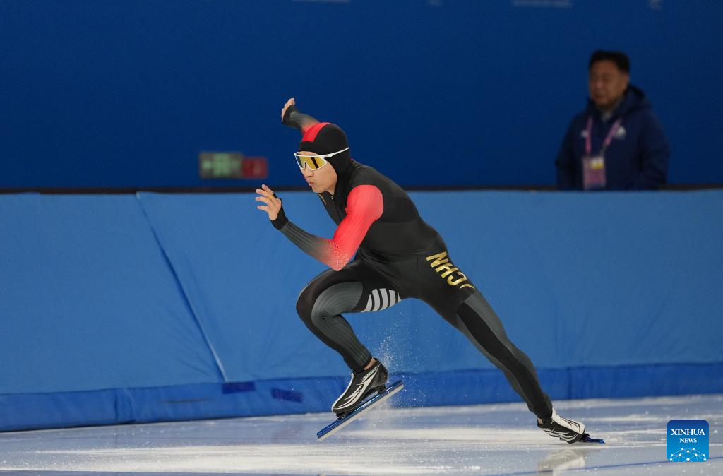 Gao Tingyu of China competes during the men's 100m final match of the speed skating event at the 9th Asian Winter Games in Harbin, northeast China's Heilongjiang Province, Feb. 8, 2025. (Xinhua/Wang Jianwei)