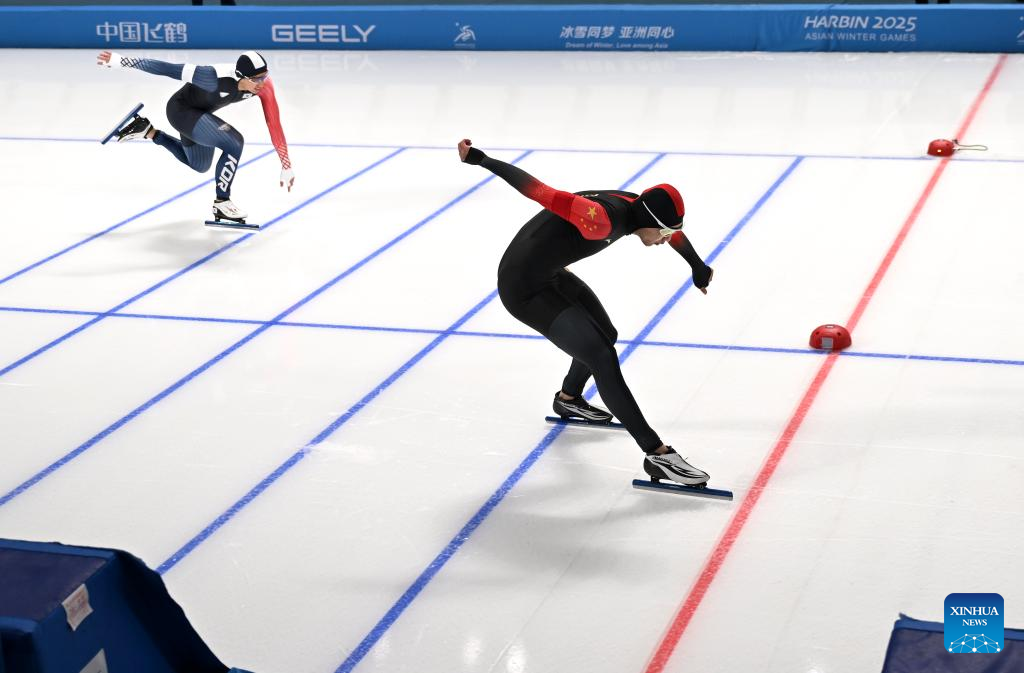 Gao Tingyu of China competes during the men's 100m final match of the speed skating event at the 9th Asian Winter Games in Harbin, northeast China's Heilongjiang Province, Feb. 8, 2025. (Xinhua/Li Yibo)