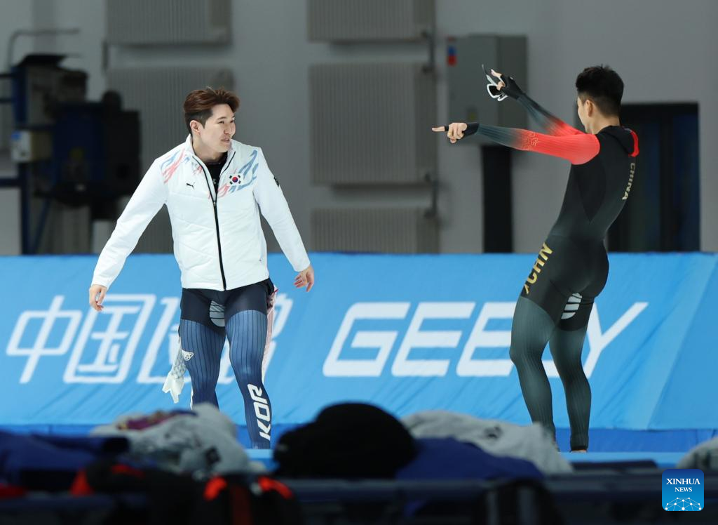 Gao Tingyu of China react before the men's 100m final match of the speed skating event at the 9th Asian Winter Games in Harbin, northeast China's Heilongjiang Province, Feb. 8, 2025. (Xinhua/Li Yibo)