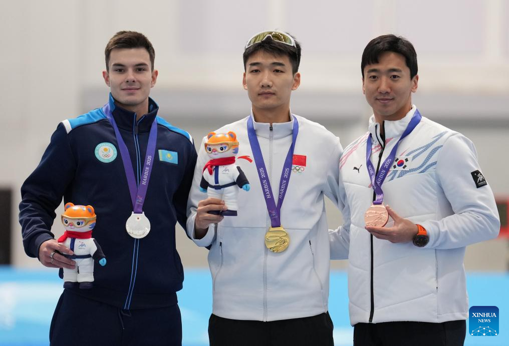 Gold medalist Gao Tingyu (C) of China, silver medalist Yevgeniy Koshkin of Kazakhstan and bronze medalist Kim Junho of South Korea pose during the awarding ceremony after the men's 100m final match of the speed skating event at the 9th Asian Winter Games in Harbin, northeast China's Heilongjiang Province, Feb. 8, 2025. (Xinhua/Li Yibo)