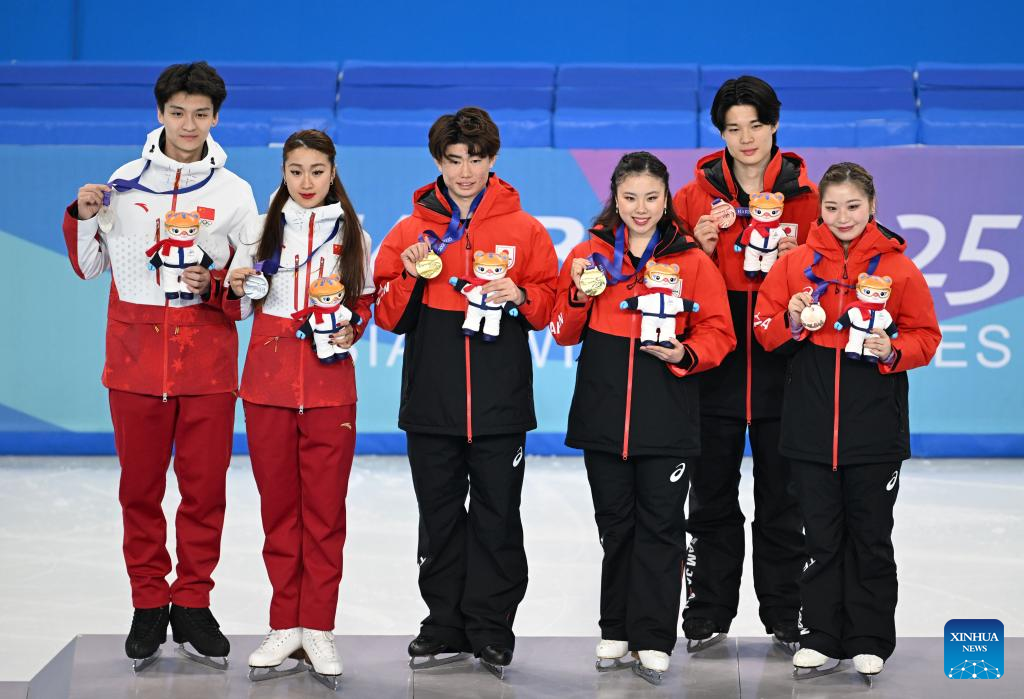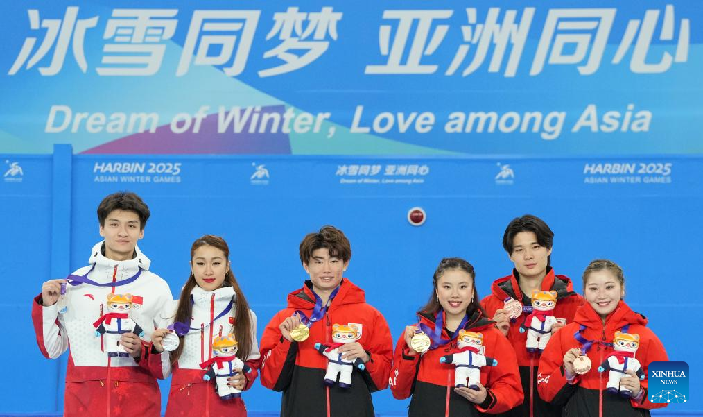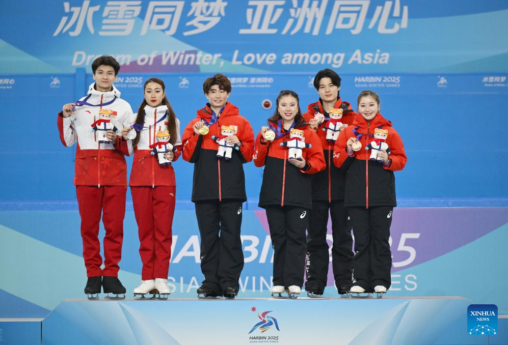 Gold medalists Yoshida Utana/Morita Masaya of Japan, silver medalists Ren Junfei/Xing Jianing of China and bronze medalists Tanaka Azusa/Nishiyama Shingo of Japan attend the awarding ceremony for the ice dance of figure skating event at the 9th Asian Winter Games in Harbin, northeast China's Heilongjiang Province, Feb. 12, 2025. (Xinhua/Yan Linyun)