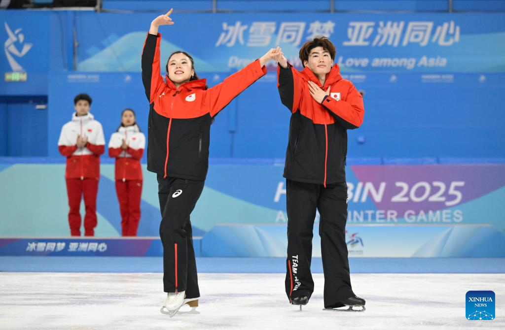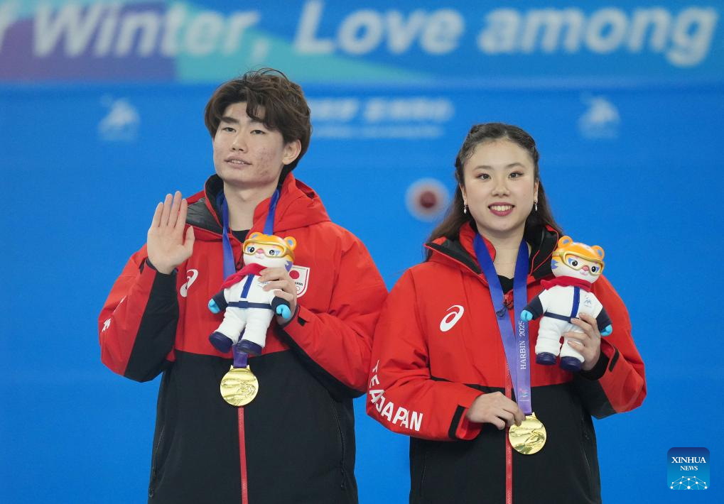Gold medalists Yoshida Utana (R)/Morita Masaya of Japan attend the awarding ceremony for the ice dance of figure skating event at the 9th Asian Winter Games in Harbin, northeast China's Heilongjiang Province, Feb. 12, 2025. (Xinhua/Yan Linyun)