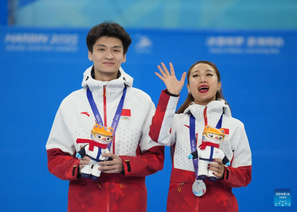 Silver medalists Ren Junfei (R)/Xing Jianing of China attend the awarding ceremony for the ice dance of figure skating event at the 9th Asian Winter Games in Harbin, northeast China's Heilongjiang Province, Feb. 12, 2025. (Xinhua/Yan Linyun)
