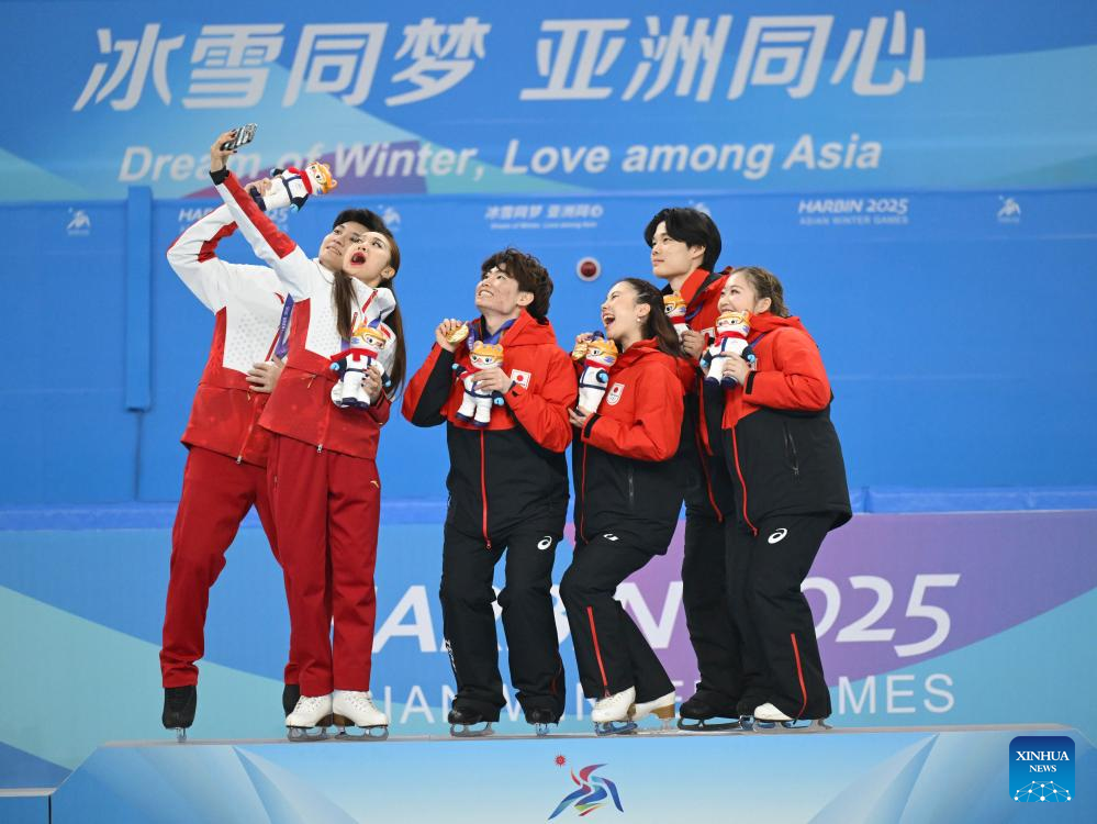 Gold medalists Yoshida Utana/Morita Masaya of Japan, silver medalists Ren Junfei/Xing Jianing of China and bronze medalists Tanaka Azusa/Nishiyama Shingo of Japan pose for a selfie at the awarding ceremony for the ice dance of figure skating event at the 9th Asian Winter Games in Harbin, northeast China's Heilongjiang Province, Feb. 12, 2025. (Xinhua/Yan Linyun)