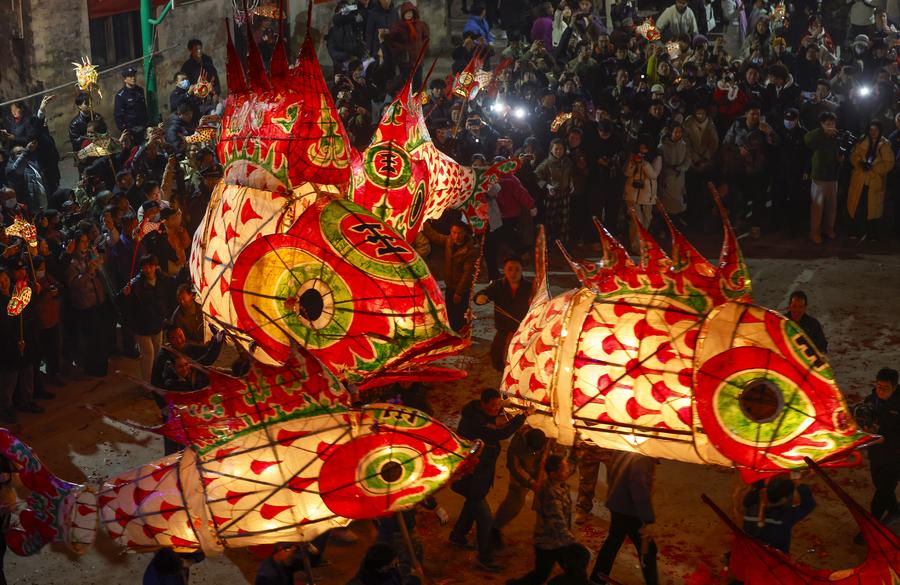 SHEXIAN, Feb. 12 (Xinhua) -- Local villagers in Wangmantian Village of Xitou Town in Shexian County, Huangshan City of east China's Anhui Province, have the tradition to make fish-shaped lanterns to pray for harvest and good fortune and parade with them cheerfully around the Lantern Festival, which falls on the 15th day of the first month of the Chinese lunar calendar, or Feb. 12 this year.