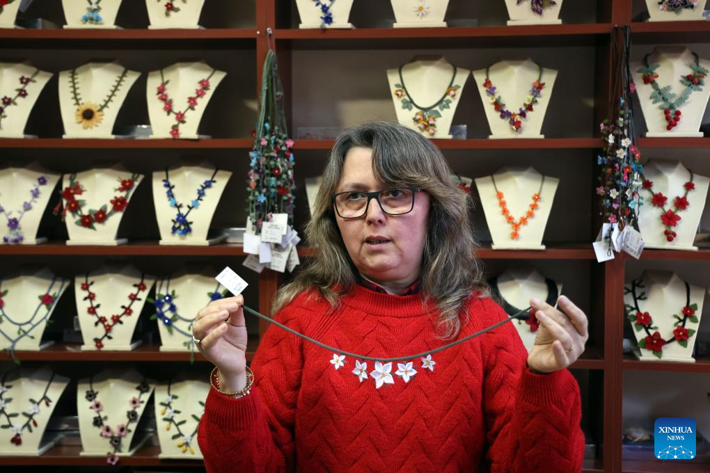 A woman shows a silk needle lace product at a shop in Nallihan, a remote district of Türkiye's capital Ankara, on Feb. 10, 2025. (Mustafa Kaya/Handout via Xinhua)