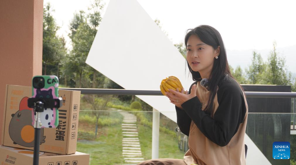 A video screenshot shows Ming Yue promoting bergamot via live-streaming in Leshan, southwest China's Sichuan Province in October 2024. (Xinhua/Xue Chen)