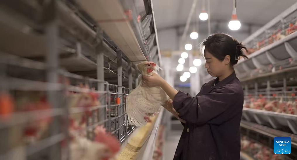 This undated photo shows Ming Yue checking a hen in a chicken house in Leshan, southwest China's Sichuan Province. (Xinhua)