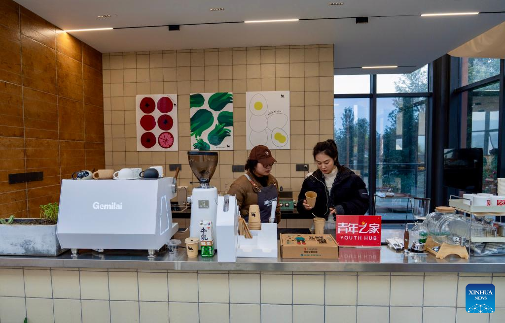 Ming Yue (R) discusses with her team member at the Chicken Farm Café in Leshan, southwest China's Sichuan Province, Jan. 8, 2025. (Xinhua/Xue Chen)
