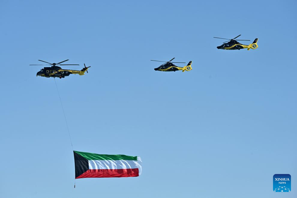 Kuwaiti police helicopters fly in celebration of the Independence Day and the Liberation Day over Kuwait City, Kuwait, on Feb. 25, 2025. (Photo by Asad/Xinhua)