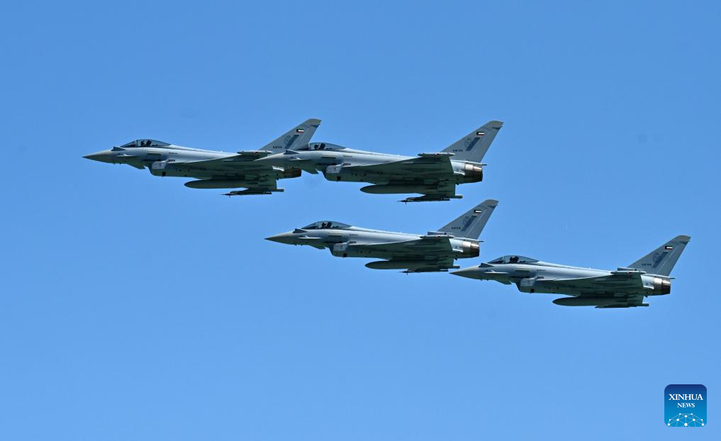 Eurofighter Typhoons fly in celebration of the Independence Day and the Liberation Day over Kuwait City, Kuwait, on Feb. 25, 2025. (Photo by Asad/Xinhua)