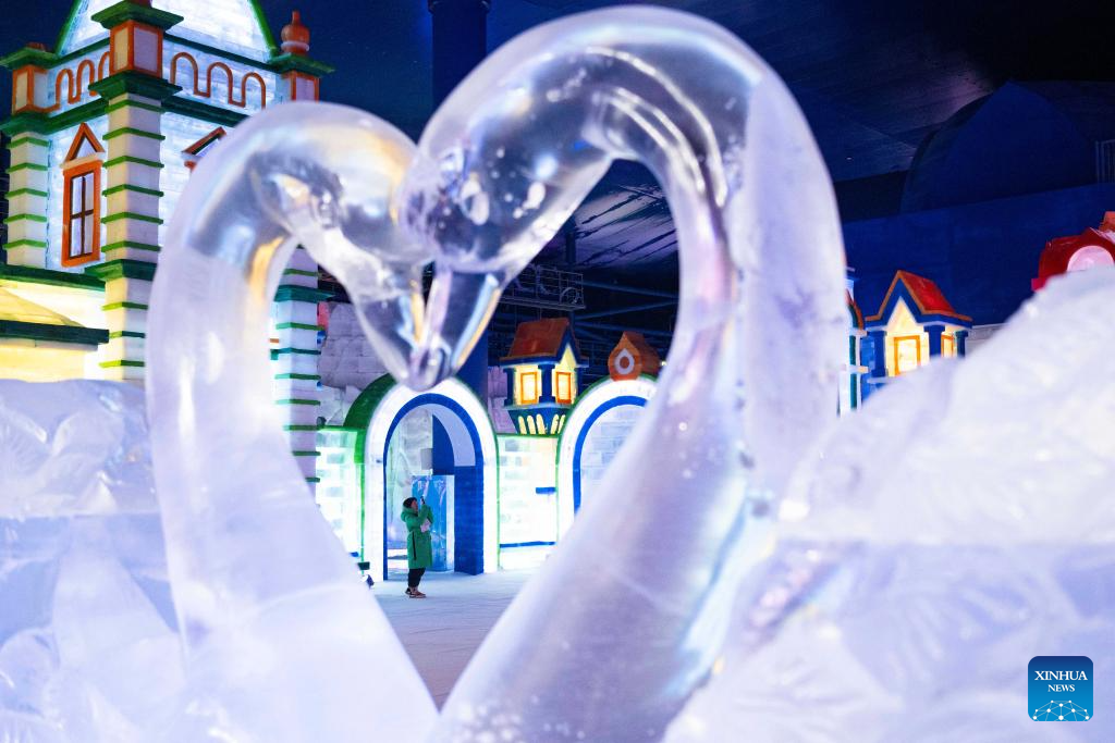 A visitor is pictured near a heart-shaped ice sculpture at an indoor ice-and-snow theme park within Harbin Ice-Snow World in Harbin, northeast China's Heilongjiang Province, Feb. 27, 2025. The world's largest indoor ice-and-snow theme park, a facility located within Harbin Ice-Snow World, reopened on Thursday morning as the outdoor Harbin Ice-Snow World officially closed its 26th edition on Wednesday. Covering an area of 23,000 square meters, the indoor ice-and-snow attraction has seen a comprehensive refurbishment. Initially launched in July 2024, the facility features advanced audio-visual interactivity, vibrant ice sculptures, and elements from past editions of the park and the 2025 Asian Winter Games. (Xinhua/Xie Jianfei)