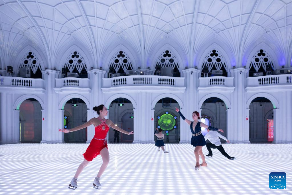 An ice dance performance is staged at an indoor ice-and-snow theme park within Harbin Ice-Snow World in Harbin, northeast China's Heilongjiang Province, Feb. 27, 2025. The world's largest indoor ice-and-snow theme park, a facility located within Harbin Ice-Snow World, reopened on Thursday morning as the outdoor Harbin Ice-Snow World officially closed its 26th edition on Wednesday. Covering an area of 23,000 square meters, the indoor ice-and-snow attraction has seen a comprehensive refurbishment. Initially launched in July 2024, the facility features advanced audio-visual interactivity, vibrant ice sculptures, and elements from past editions of the park and the 2025 Asian Winter Games. (Xinhua/Zhang Tao)