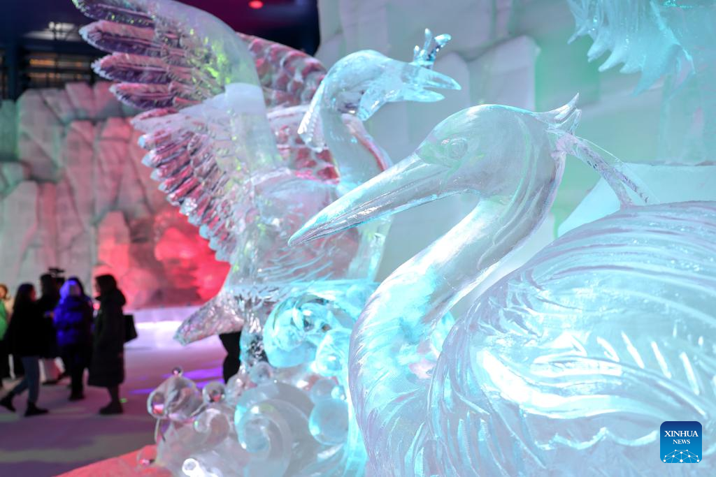 Tourists appreciate the ice-and-snow sculptures at an indoor ice-and-snow theme park within Harbin Ice-Snow World in Harbin, northeast China's Heilongjiang Province, Feb. 27, 2025. The world's largest indoor ice-and-snow theme park, a facility located within Harbin Ice-Snow World, reopened on Thursday morning as the outdoor Harbin Ice-Snow World officially closed its 26th edition on Wednesday. Covering an area of 23,000 square meters, the indoor ice-and-snow attraction has seen a comprehensive refurbishment. Initially launched in July 2024, the facility features advanced audio-visual interactivity, vibrant ice sculptures, and elements from past editions of the park and the 2025 Asian Winter Games. (Xinhua/Xie Jianfei)