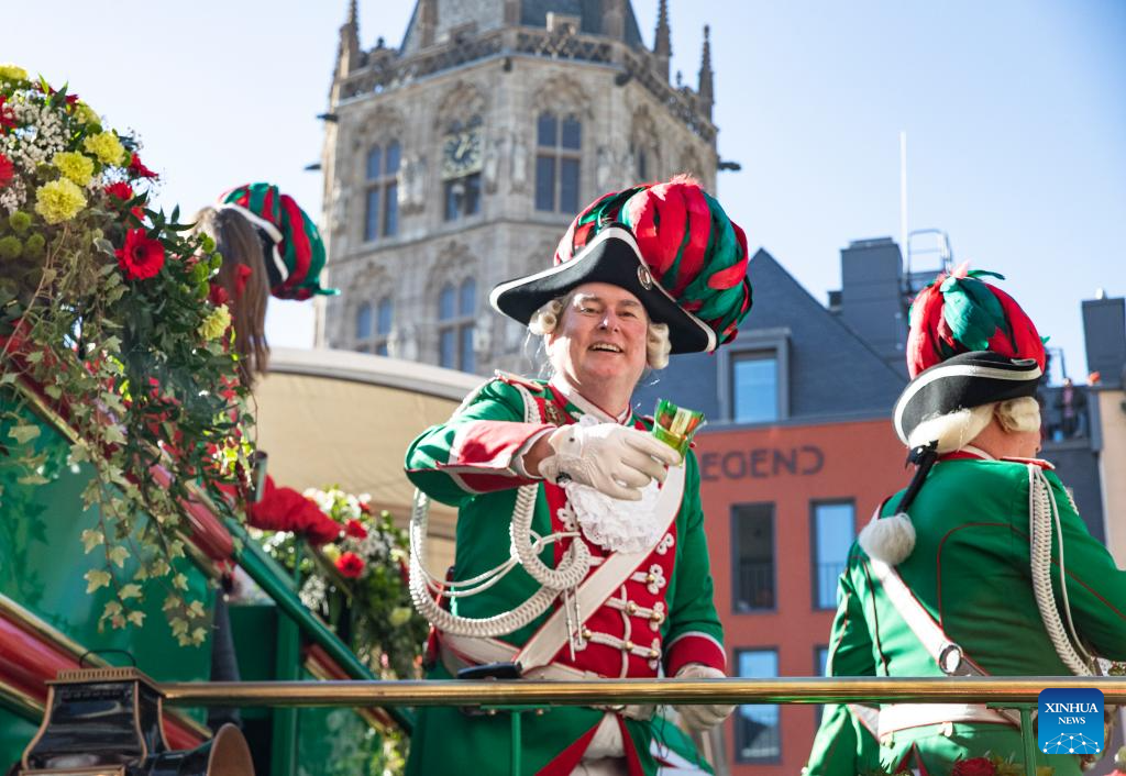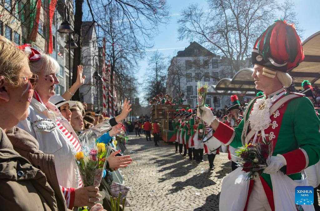 A reveler offers flowers to the crowd during the Rose Monday carnival parade in Cologne, Germany, March 3, 2025. Rose Monday is the biggest one of its kind held during the annual carnival season in this city of historical heritages. (Xinhua/Zhang Fan)