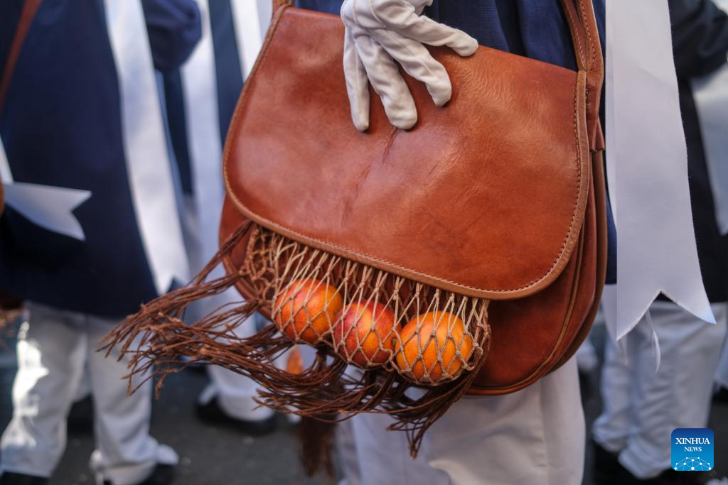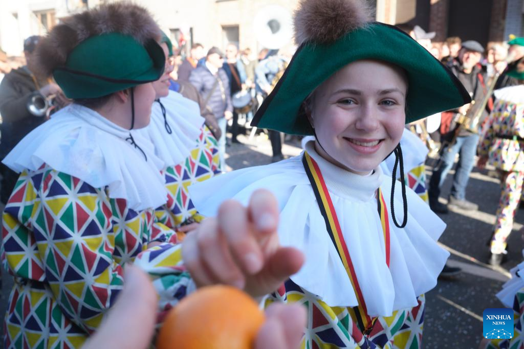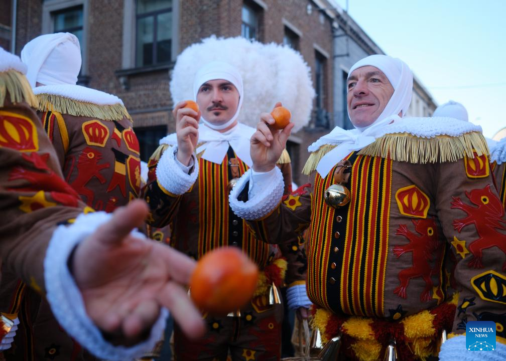 A man carrying oranges attends the Binche Carnival, a UNESCO World Heritage event, in Binche, Belgium, March 4, 2025. (Xinhua/Meng Dingbo)