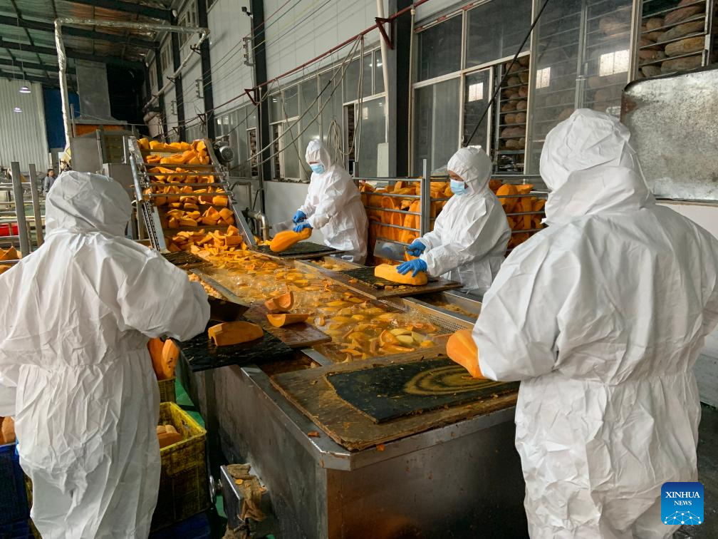 GUIYANG, March 7 (Xinhua) -- Yang Chuang, a farmer in a remote village in southwest China's Guizhou Province, harvested over 700 tonnes of pumpkins last year, which were processed into dehydrated pumpkin strips and exported to the Republic of Korea (ROK).