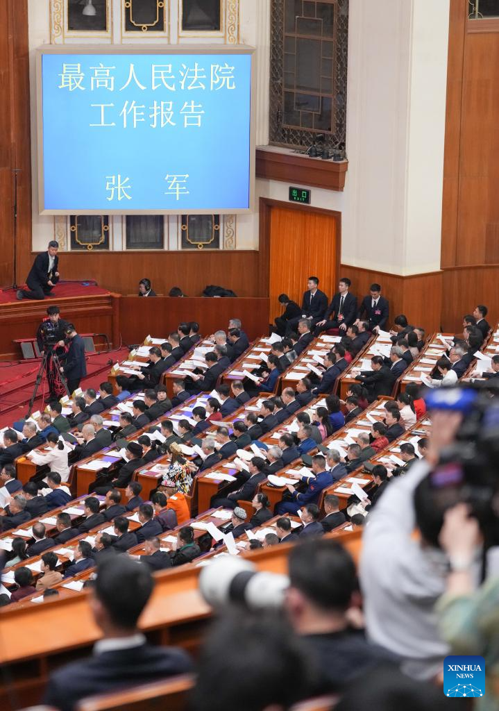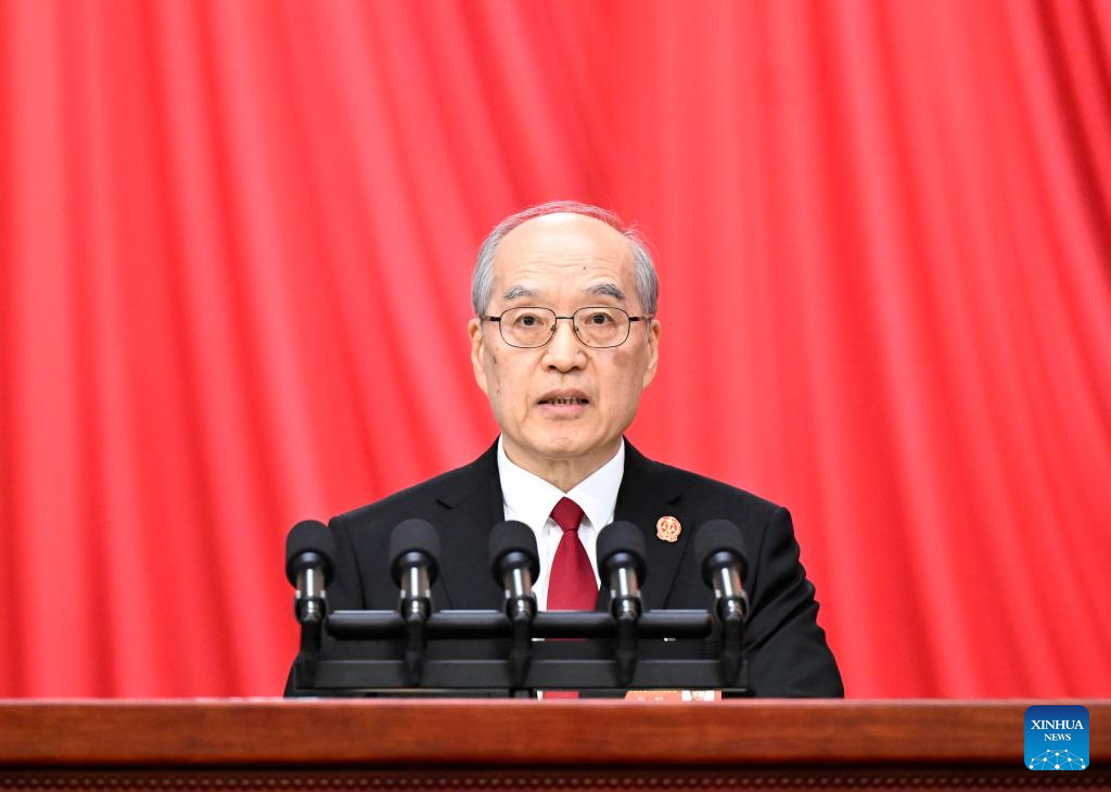 Zhang Jun, president of the Supreme People's Court (SPC), delivers a work report of the SPC at the second plenary meeting of the third session of the 14th National People's Congress (NPC) at the Great Hall of the People in Beijing, capital of China, March 8, 2025. (Xinhua/Shen Hong)