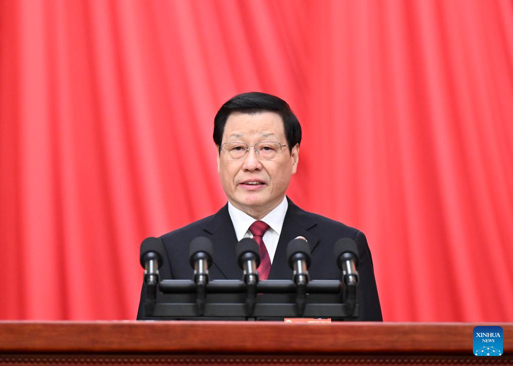 Zhao Leji, chairman of the National People's Congress (NPC) Standing Committee, delivers a work report of the NPC Standing Committee at the second plenary meeting of the third session of the 14th NPC at the Great Hall of the People in Beijing, capital of China, March 8, 2025. (Xinhua/Ding Haitao)