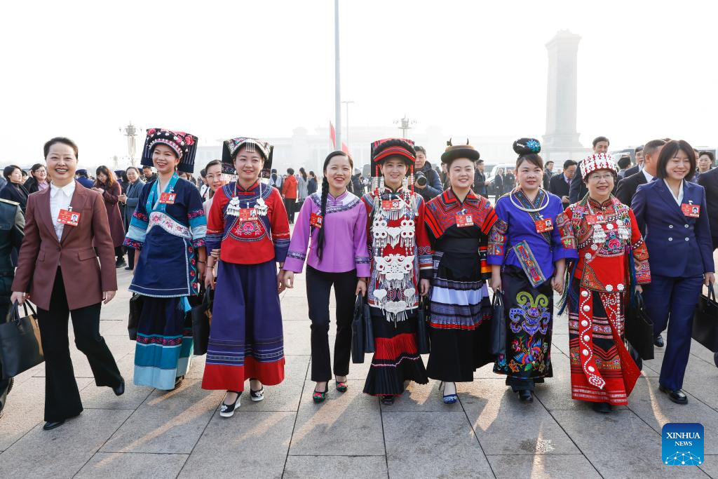 Deputies to the 14th National People's Congress (NPC) walk towards the Great Hall of the People for the second plenary meeting of the third session of the 14th NPC in Beijing, capital of China, March 8, 2025. (Xinhua/Jin Liangkuai)