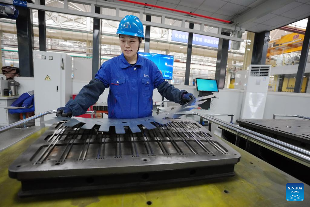 Wang Yaru, head of a spot welding team, operates at a factory of Harbin Electric Machinery Company Limited under Harbin Electric Corporation in Harbin, northeast China's Heilongjiang Province, March 7, 2025. (Xinhua/Wang Song)