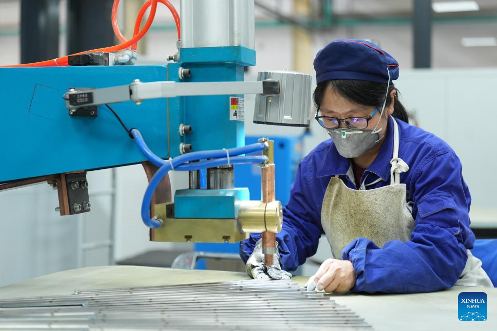 A female welder performs manual spot welding at a factory of Harbin Electric Machinery Company Limited under Harbin Electric Corporation in Harbin, northeast China's Heilongjiang Province, March 7, 2025. (Xinhua/Wang Song)