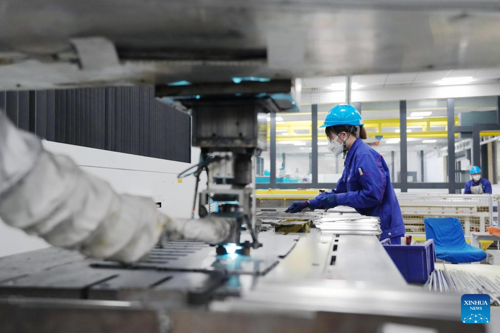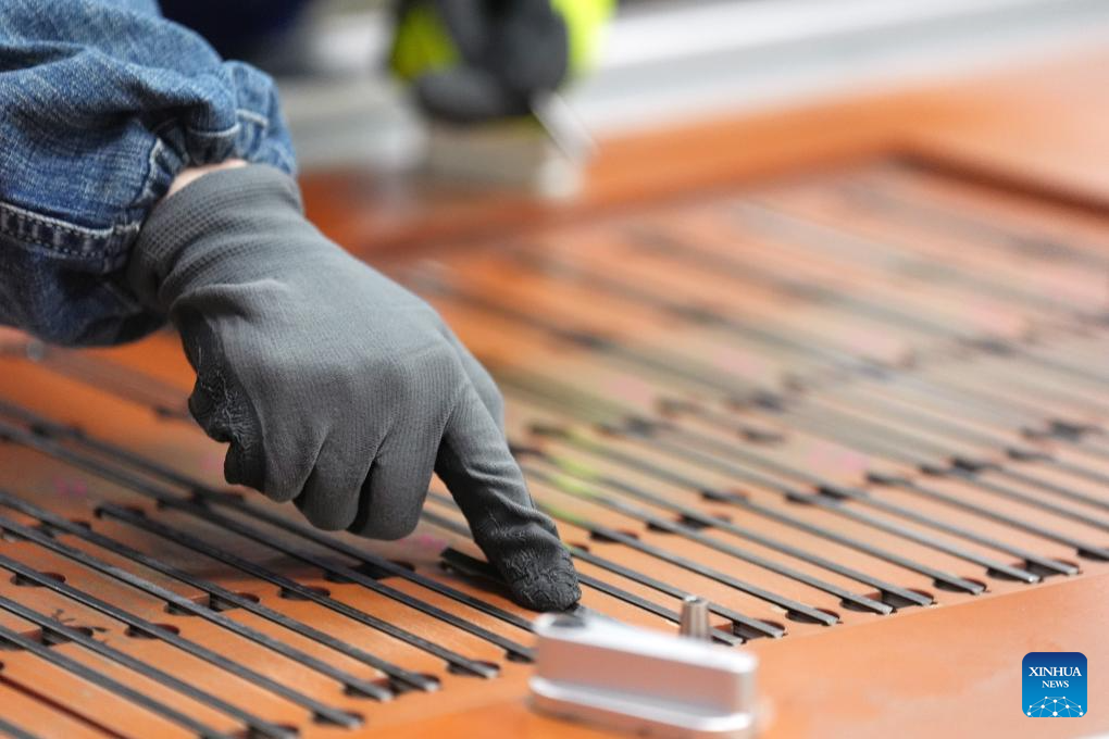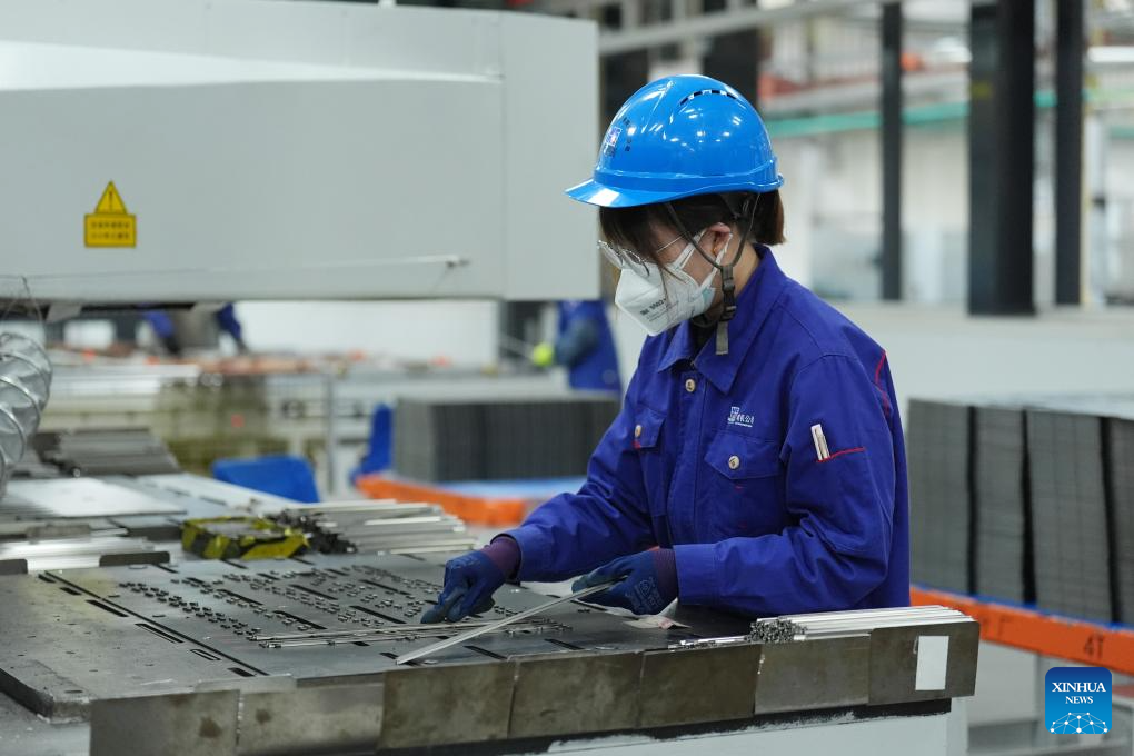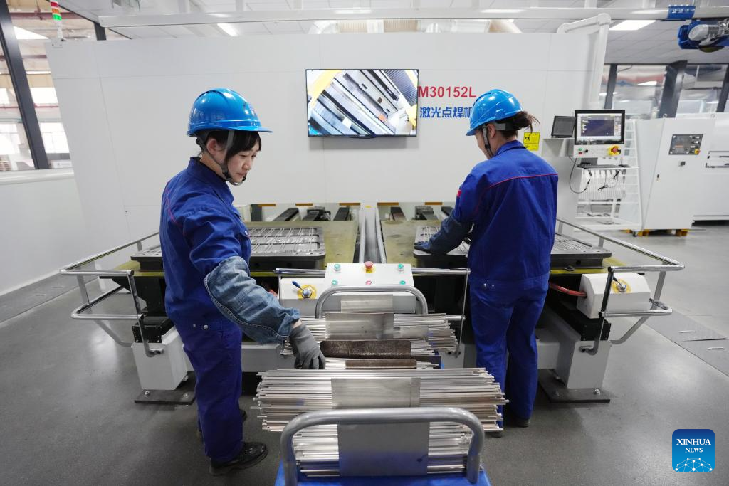 A female welder performs automatic resistance spot welding at a factory of Harbin Electric Machinery Company Limited under Harbin Electric Corporation in Harbin, northeast China's Heilongjiang Province, March 7, 2025. (Xinhua/Wang Song)