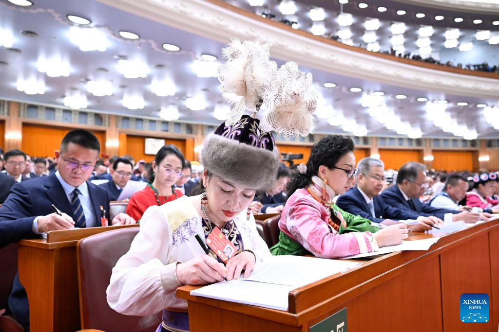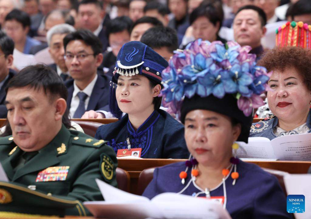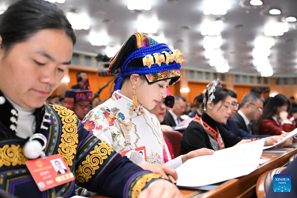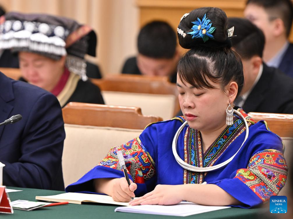 A deputy to the 14th National People's Congress (NPC) attends a group meeting of the delegation of Guizhou Province at the third session of the 14th NPC in Beijing, capital of China, March 6, 2025.