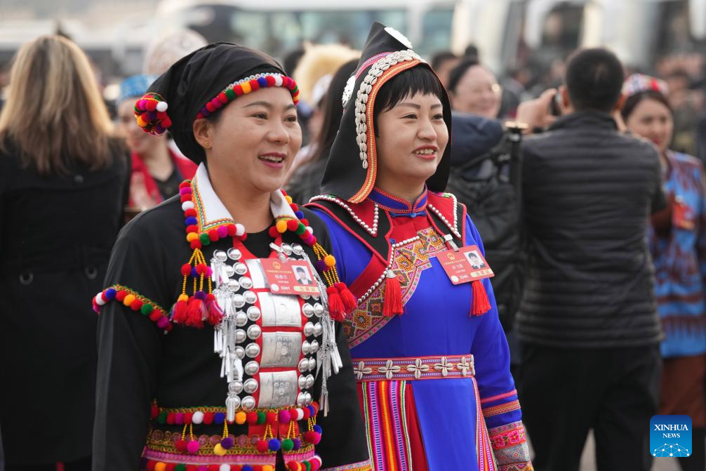 Lu Lihua (C), a deputy to the 14th National People's Congress (NPC), attends the opening meeting of the third session of the 14th NPC at the Great Hall of the People in Beijing, capital of China, March 5, 2025.