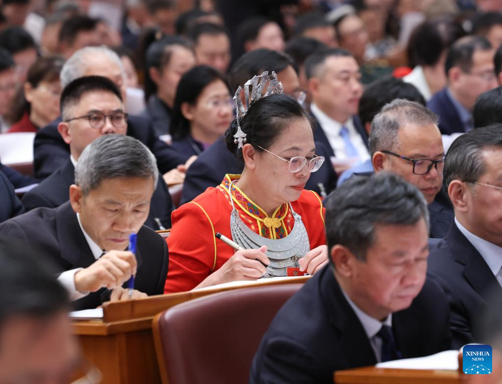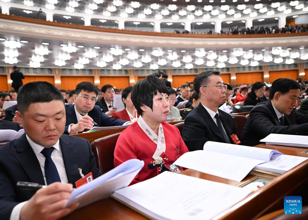Sun Yuanhua (C), a deputy to the 14th National People's Congress (NPC), attends the opening meeting of the third session of the 14th NPC at the Great Hall of the People in Beijing, capital of China, March 5, 2025.