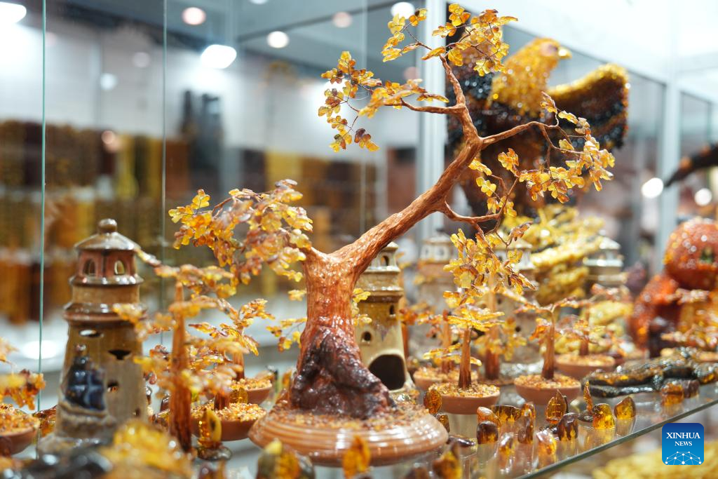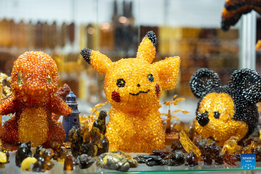Amber art pieces are displayed during the AMBERIF Spring 2025 trade fair in Gdansk, Poland, March 13, 2025. The AMBERIF Spring 2025 trade fair, a leading European event for jewelry and amber, opened Wednesday in Gdansk, Poland, attracting global exhibitors and designers.