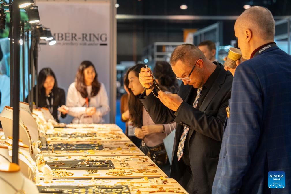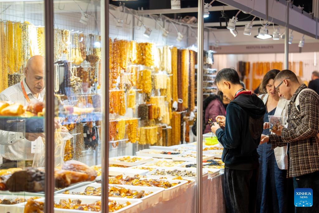 Visitors look at amber jewelry at the AMBERIF Spring 2025 trade fair in Gdansk, Poland, March 13, 2025. The AMBERIF Spring 2025 trade fair, a leading European event for jewelry and amber, opened Wednesday in Gdansk, Poland, attracting global exhibitors and designers.