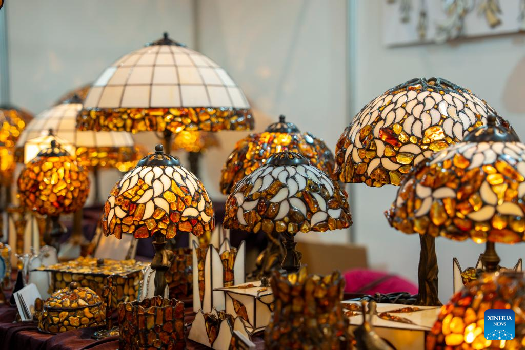 Amber table lamps are displayed during the AMBERIF Spring 2025 trade fair in Gdansk, Poland, March 12, 2025. The AMBERIF Spring 2025 trade fair, a leading European event for jewelry and amber, opened Wednesday in Gdansk, Poland, attracting global exhibitors and designers.