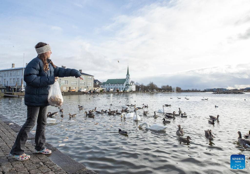 A girl feeds waterfowl at lake Tjornin in Reykjavik, Iceland, on March 15, 2025. (Xinhua/Zhang Fan)