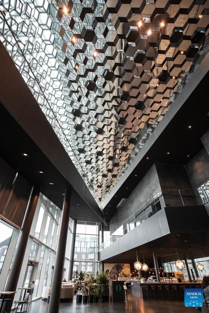 This photo taken on March 15, 2025 shows the interior view of Harpa Concert Hall and Conference Center in Reykjavik, Iceland. (Xinhua/Zhang Fan)