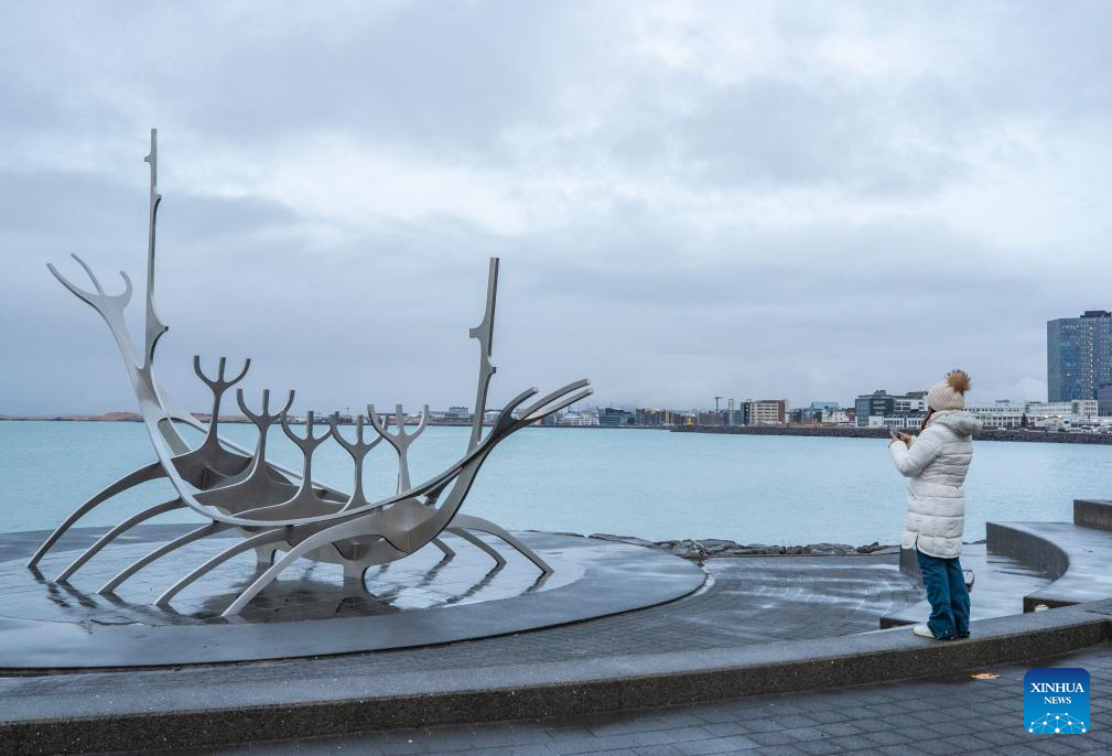 A tourist takes photos of the Sun Voyager sculpture in Reykjavik, Iceland, on March 15, 2025. (Xinhua/Zhang Fan)