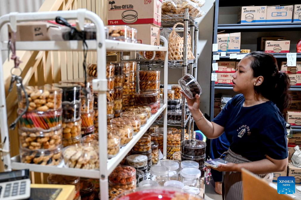 A staff member arranges packages of traditional cookies ordered by costumers for Eid al-Fitr at Kampung Nastar in Tangerang, Banten Province, Indonesia, March 16, 2025. (Xinhua/Agung Kuncahya B.)